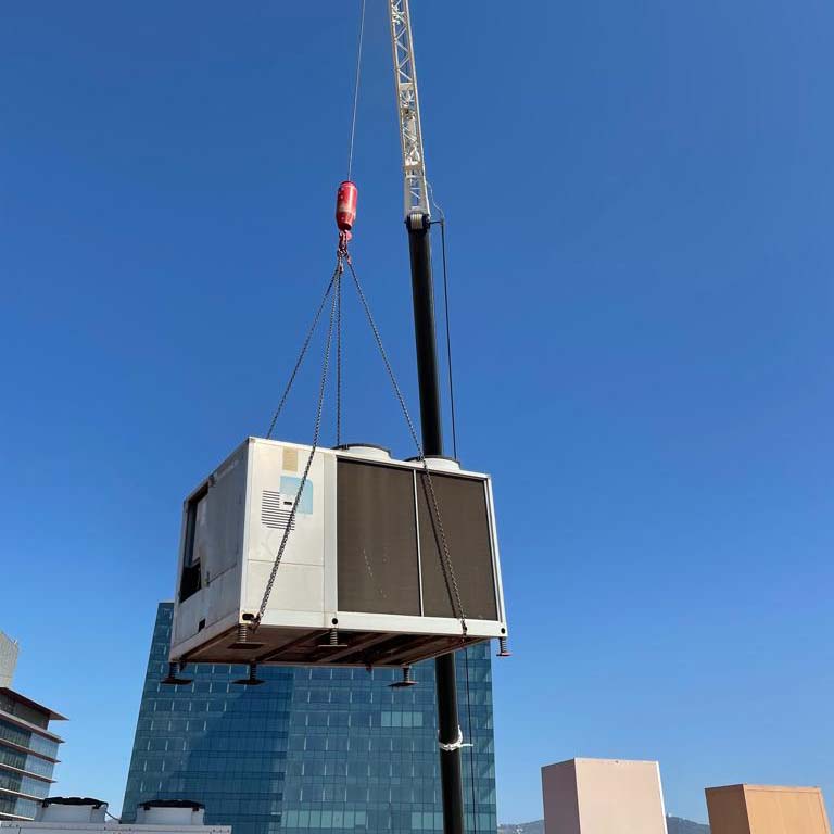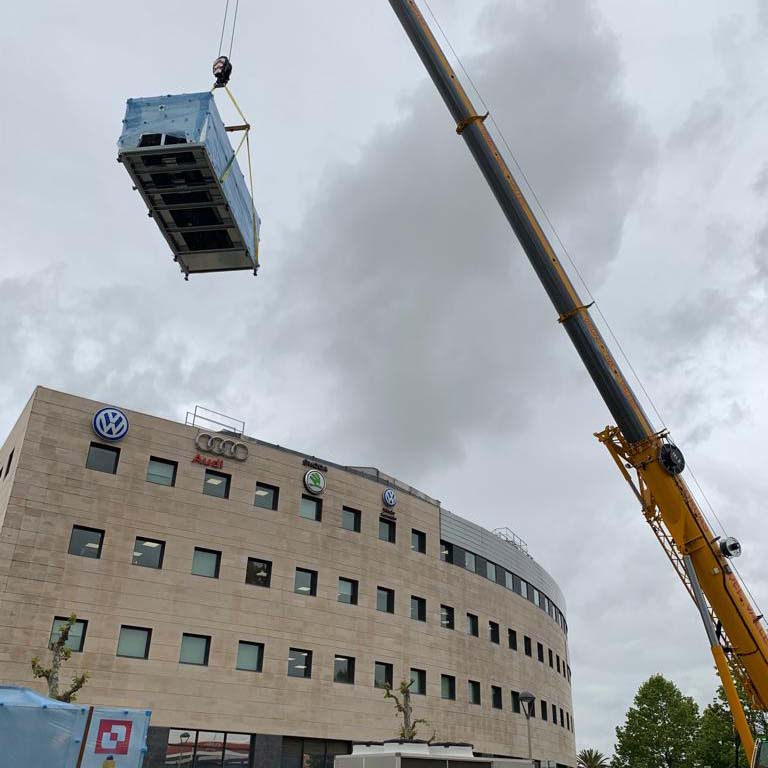 Pujada de màquina refredadora amb grua a les oficines centrals d'Audi de El Prat de Llobregat
