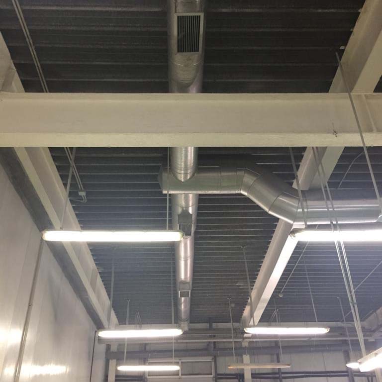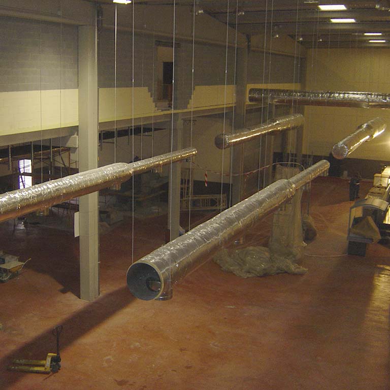 Conductes aïllats provinents de climatitzador en una nau industrial